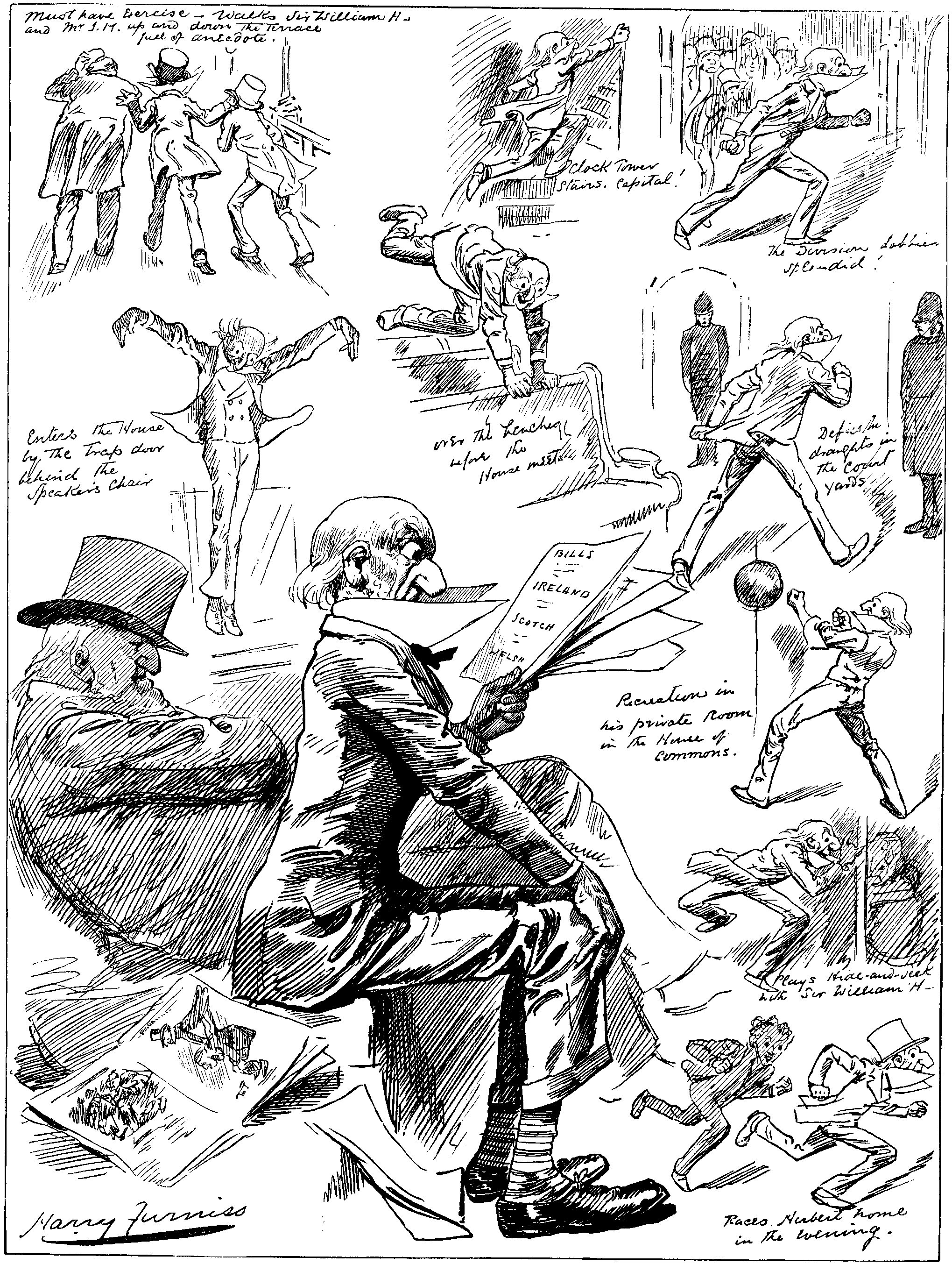 SCENE—The St. Stephen's Stables. Stall of the Favourite, "Majority," who is being inspected by the great "Vet." (S-L-SB-RY) in presence of the Groom (B-LF-R), and the Stable-help (CH-PL-N).