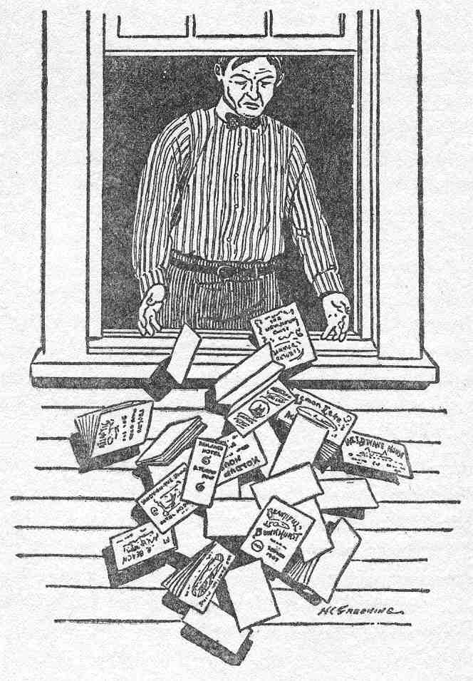 "Well, sir, it took Bird City just ten minutes to realize that it was in a cage. We expected trouble; but there wasn't any. The citizens saw that we had 'em. The nearest railroad was thirty miles away; and it would be two weeks at least before the river would be fordable. So they began to cuss, amiable, and throw down dollars on the bar till it sounded like a selection on the xylophone.