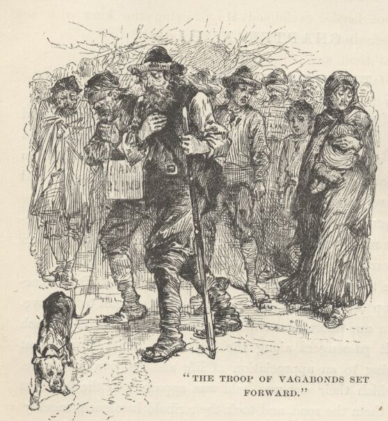 The troop of vagabonds turned out at early dawn, and set forward on their march.  There was a lowering sky overhead, sloppy ground under foot, and a winter chill in the air.  All gaiety was gone from the company; some were sullen and silent, some were irritable and petulant, none were gentle-humoured, all were thirsty.