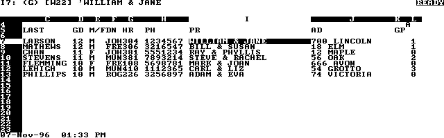 The first day of class I open up a blank version of the spreadsheet (GRADES.WK1), pass my HP Palmtop around the classroom and have the kids type in their names, classes, deans, phone numbers, addresses, and parents' names. I show one student how to do it and have him or her show the others. This is more accurate and a lot less trouble for me than copying them myself from a printed and possibly outdated list. And very easy to sort by class, dean, last name, or whatever. If I need a quick class list for a substitute teacher I hook up my Palmtop to any available printer around school and print out the spreadsheet.