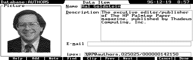 The Database application on the 100/200LX is strong and sufficient as long as it's dealing with text data. However, information isn't always found as text a picture is sometimes worth a thousand words. This motivated two authors to develop programs that enable the Palmtop to display graphical data in combination with the Database program.