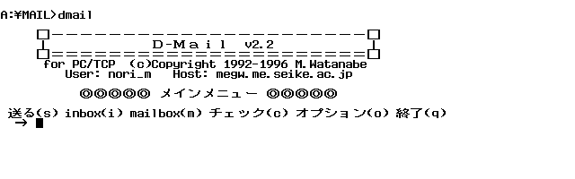 D-Mail is a software program that lets you send and receive e-mail from a DOS computer like the HP Palmtop (see screen above). It supports packet driver, PC/TCP, InetBIOS, and direct serial communications, giving you a variety of ways to send and receive e-mail. It's easy to configure it to display Japanese or English menus. You can define your favorite editor or viewer to work with D-mail, and adjust parameters such as the number of lines per screen. This particularly helps users of the Palmtop adjust for its tiny screen.