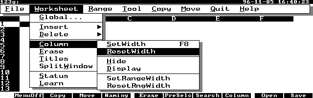 The screen of 123g . You can execute most of the operations of the Lotus 1-2-3 on the pull-down menus.