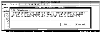 To see what a typical SSL statement looks like we'll use the subset definition in which the Number field has <10000,>700000 in it. If you press F6(subset) and then press F4(Edit) you'll see the "Edit General subset Definition" window. In the SSL Statement field you should see (NumberField<10000 | NumberField >700000) as in Screen 3.