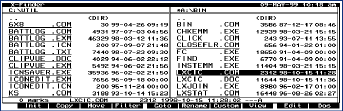 The default, opening screen is set up to select from three palmtop drives, remote drives and the split screen file manager. It is also configured to open the Phonebook and Appointment PIMs, to run CHKDSK on either A or C, and to do remote backups. This is my personal configuration. However, with X-Finder, you can adopt the configuration provided with the initial installation, tweak it a little or tweak it a lot as I have. Almost everything about XF is user-definable.