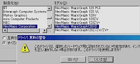 ビデオ・チップは、NeoMagic社のMgicGraph128VZ+だと分かっていたので、Win98に登録されていた128ZVやFujitsuのFMWORLDや、巷で拾って来た128ZV、はたまた128AV、128Vなども充ててみましたが、どれも「不適合の警告」が出て無理に充当すると表示異常になります。