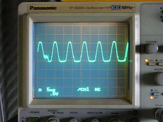 今は、Sin波なので、それが、出力としてどのようになるかをオシロスコープで見た。プローブの倍率を1/10にしてあるので、0.5Vは5Vを意味している。(図5、図6<クリック>