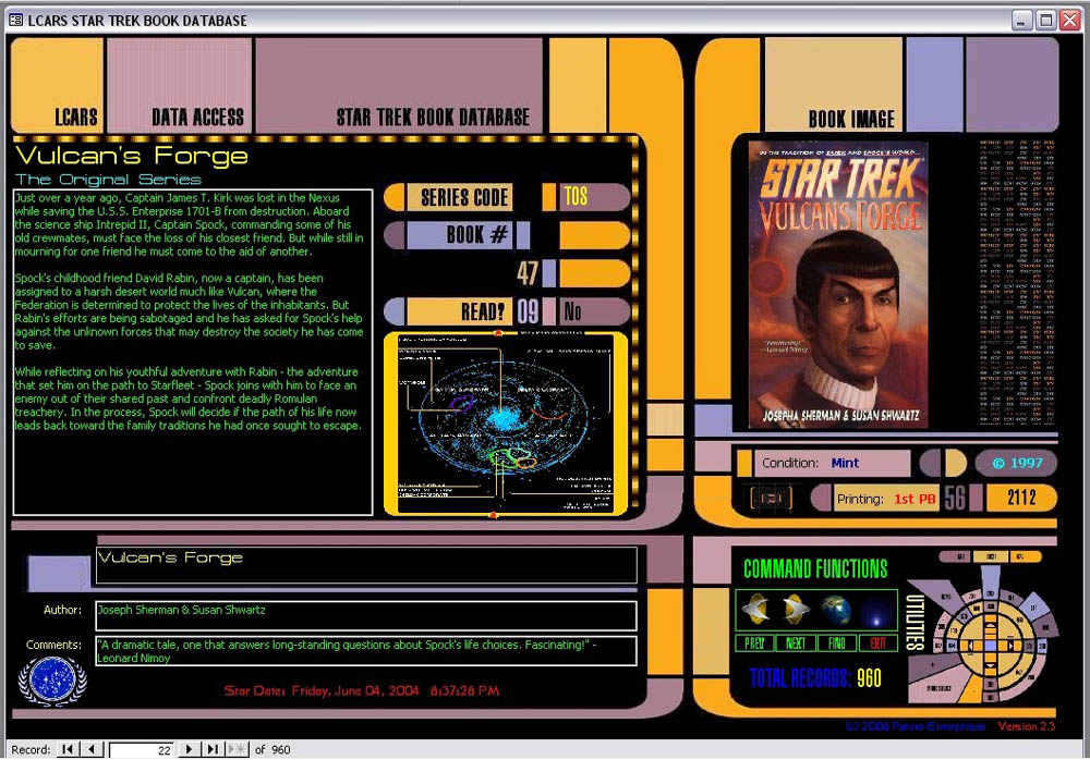 Witness the result. Utilizing MS-Access, I've developed a system that has the true LCARS feel, with animated graphics, expandable and customizeable features and limitless storage capabilities. Now I'm offering the database structure for sale. Don't worry - it won't include my list of books (which you can see on this site).
